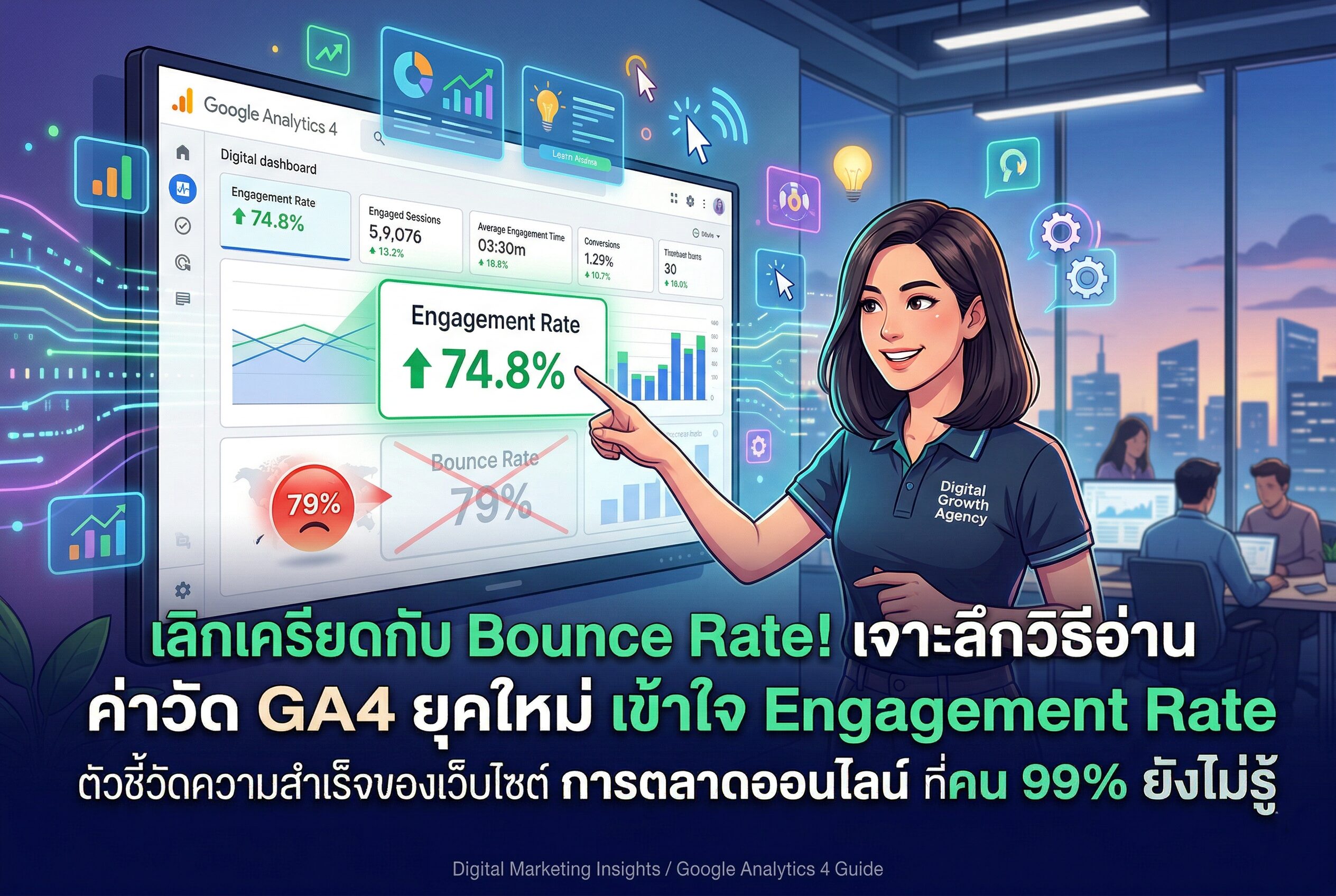 แต่วันนี้ ในโลกของ การตลาดออนไลน์ ปี 2026 กูเกิลได้ยกเครื่องระบบใหม่ทั้งหมดสู่ Google Analytics 4 (GA4) และได้ทำการ “ฆ่า” ค่าวัด Bounce Rate แบบเดิมทิ้งไปอย่างถาวร! DigitalD2M จะพาคุณมา วิเคราะห์เว็บไซต์ ด้วยมุมมองใหม่ เราจะมาเจาะลึก ค่าวัด GA4 ที่ทรงพลังที่สุดในยุคนี้ นั่นคือ “Engagement Rate (อัตราการมีส่วนร่วม)” มาดูกันว่าตัวเลขนี้จะช่วยให้คุณเข้าใจพฤติกรรมลูกค้าที่แท้จริง และสเกลยอดขายได้อย่างไร แบบเจาะลึกทุกกลไกครับ!