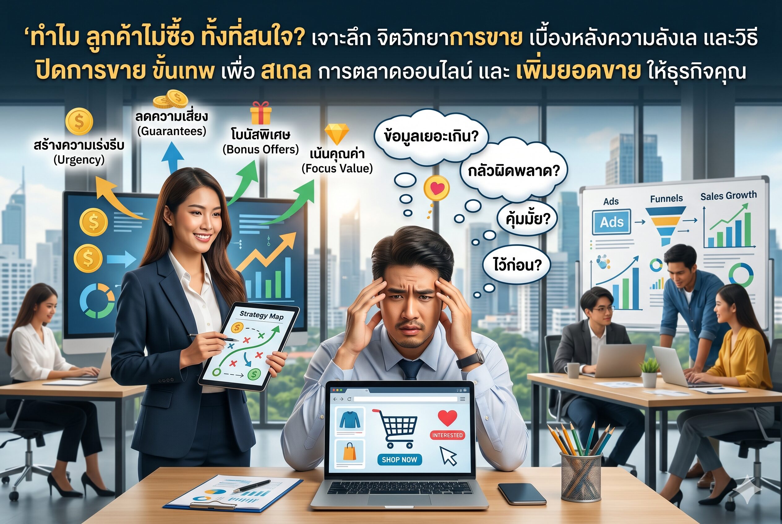 ดังนั้น เมื่อ ลูกค้าไม่ซื้อ ทั้งที่ดูสนใจมาก เป็นเพราะพวกเขากำลัง “กังวลเรื่องความผิดพลาด” ครับ ถ้าคุณเอาแต่สาดสรรพคุณสินค้าใส่เขา คุณกำลังเพิ่มภาระให้เขายิ่งคิดหนัก หน้าที่ของคุณคือการเปลี่ยนจากคนขาย เป็น “ที่ปรึกษา” ที่ช่วยยืนยันว่าการจ่ายเงินครั้งนี้เป็นการตัดสินใจที่ฉลาดที่สุดของเขาครับ